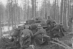 La desmovilización finlandesa y las difíciles rutas de suministro pasaron factura. En Tankavaara, a 60 km al sur de Ivalo, apenas cuatro batallones de la Brigada finlandesa de Cazadores intentaron, sin éxito, el 26 de octubre desalojar la 169.ª División de Infantería alemana de doce batallones, atrincherados en fortificaciones preparadas. Las fuerzas finlandesas ganaron terreno solo el 1 de noviembre, cuando los alemanes se retiraron hacia el norte.[58] Del mismo modo, el 26 de octubre en Muonio, a 200 km al sudeste de las posiciones defensivas en Noruega, la 6.ª División de Montaña SS Nord reforzada por Kampfgruppe Esch volvió a tener superioridad numérica y material con artillería y apoyo blindado. Esto impidió que la 11.ª División finlandesa ganara ventaja a pesar de las operaciones de flanqueo inicialmente bastante exitosas por parte de los Regimientos de Infantería 8 y 50. Los finlandeses planearon aislar la División de Montaña SS, marchando desde la dirección de Kittilä en el sureste, antes de Muonio y por lo tanto atraparlo dentro de un motti. La acción dilatoria del Kampfgruppe Esch y la red de carreteras destruida frustraron la estrategia finlandesa.[59]