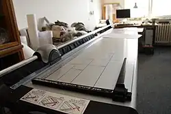 Las guillotinas para papel vienen en distintos tamaños, por lo general desde unos 30 cm de largo en las que se utilizan para trabajos de oficina hasta 85 cm (la longitud del lado de una hoja A1) en los talleres de diseño. Por lo general la superficie posee grabado o impresa una grilla cuadrangular de 1 cm de lado, y puede tener una regla en su parte superior. Por lo menos debe tener un borde plano contra el cual el usuario alinea el papel en ángulo recto antes de accionar la cuchilla de corte. Por lo general es relativamente pesada, de forma tal que no se desplace al utilizarla.