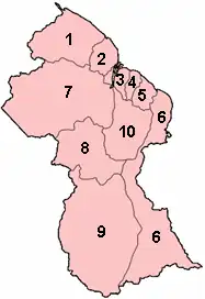 Guyana está organizada en diez regiones administrativas que se dividen en sesenta y cinco consejos vecinales y seis municipios o ciudades.[50]