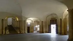 En la planta baja se encuentra un vestíbulo de bóveda muy baja, formado por dos cunas en ángulo recto, caídas en callejón sin salida y conectadas a los muros por vidrios. A pesar de la luz que alcanza los 15 m, la flecha del arco es muy baja. El visitante está allí frente a la obra maestra absoluta de la estereotomía francesa, que reúne con un virtuosismo inigualable todas las características de este arte: rebajamiento, juego con el dispositivo, desnudez del intradós.[4]