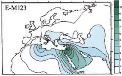 - E-V13 (L142.1, V36) es típico de Europa y es el haplogrupo E con las mayores frecuencias fuera de África. Es importante en los Balcanes, especialmente en el Peloponeso griego (47 %),[3] en albaneses de Kosovo (46 %),[56] albaneses de Macedonia del Norte (34 %), también en Grecia, Bulgaria, Rumania, Serbia y Kursk; poco en el sur de Italia, en turcochipriotas y druzos. En Europa Occidental promedia 2.5%, en Anatolia 4% y en el Cercano Oriente 2%.[10] Se estima que bajas frecuencias encontradas en Pakistán provienen de antiguos soldados griegos y otras en Gran Bretaña provienen de soldados romanos de origen balcánico. En general, se considera que la presencia de V13 en el Mediterráneo europeo está inflído por la colonización griega.[57]