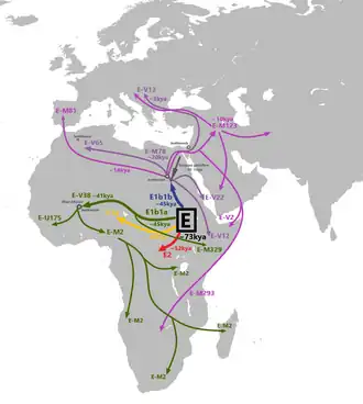 - E1b1a1 (P1/PN1, M2/DYS271/SY81, M180, M291 y 261 marcadores más), antes E3a, es predominante en hablantes de lenguas nigero-congoleñas, tiene la mayor diversidad y alta frecuencia en África Occidental (80 %).[23] Es también mayoritario en la población negra de América, encontrándose en afroamericanos de EE. UU. un 62 %[29] y tiene menores frecuencias en Norte de África, Cuerno de África y Cercano Oriente. Alta frecuencia en los bamilekes con 100 %,[30] en los nande 100 %, ewé 97 %, ga 97 %, fante 84 %, ovambo 82 %, baganda 77 %, hereros 71 %,[18] yorubas 93%,[31] en pueblos bantoides del sur de Camerún como bamilekes, ewondo y bakaka promedia 93 %, en fulanis s de Burkina Faso 90 %,[16] en igbos 89 %, en hablantes de lenguas Cross de Nigeria 87%,[32] en mandingas 87 %,[17] en bantúes de Gabón 86%,[33] en Senegal 81 %,[34] en Bijagós 76 %, balantas 73 %, fulanis 73 %, nalúes 71 %,[17] en los luo 66 %,[18] wólof 68 %, zulúes 55 % y xhosas 54 %.[18] En Madagascar es el principal linaje con 35 %,[35] encontrándose en los tandroy de Androy 70 %, antanosy de Anosy 49 %, merina de Antananarivo 44 % y antaisaka de Atsimo-Atsinanana 37.5%.[36] En América es frecuente en Las Bahamas con 59%.[37]