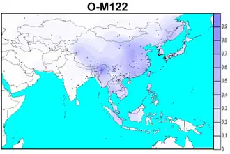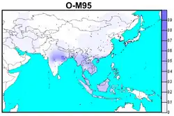 - O1b1a1a (M95) Común en hablantes de lenguas austroasiáticas, tai-kadai y malayo-polinesias. Se encontró en Taiwán, Malasia, Indonesia, Madagascar y Polinesia.[14] Al oriente de la India se encontró 53-73% en austroasiáticos, 18-56% en tribus tibeto-birmanas,[26][27] 27% en tribus drávidas y 15% en India en general.[26] Expandido hacia Medio oriente y Asia central.