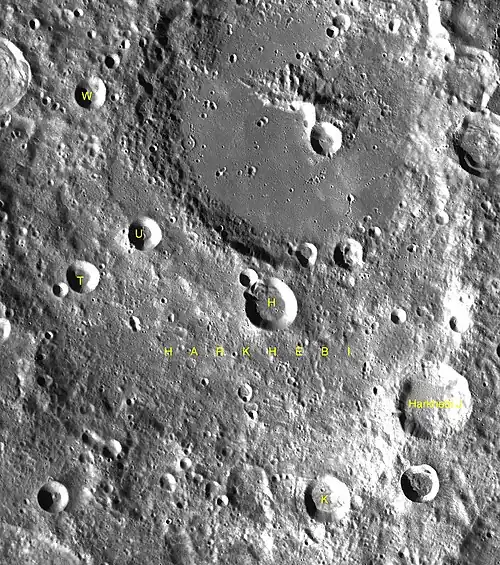 Por convención estos elementos se identifican en los mapas lunares colocando la letra en el lado del punto central del cráter más cercano a Harkhebi.