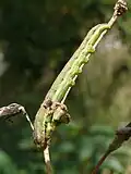 La larva es de color marrón o verde oscuro con un largo diamante en el dorso. Se alimenta de las flores y capullos de diversas flores amarillas de la familia Asteraceae como Crepis, Hieracium y Sonchus. La especie pasa el invierno como pupa.