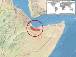Es endémica del norte de Somalia. Su rango altitudinal oscila alrededor de 457 m s. n. m..