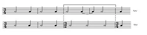 Algunos músicos se refieren a la siguiente figura como hemiola horizontal.[10] El patrón consiste en un esquema de ritmo binario seguido de un esquema de ritmo ternario.