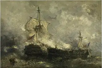 Hendrik Frans Schaefels combinó en su trabajo esta tradición de pintura de historia y arte marino. Destacó en sus dramáticas representaciones de batallas navales y otros eventos históricos que tuvieron lugar en el mar, como la Batalla de Trafalgar, episodios de las guerras entre Inglaterra y la República Holandesa. Sus grandes composiciones, con tamaños que varían de 2 a 9 metros de largo, muestran a menudo un diseño pseudobarroco. Schaefels pintó ambas composiciones que representan una batalla naval completa, así como más episodios anecdóticos que representan la acción en la cubierta de un solo buque de guerra como en la Muerte de Nelson. Para sus batallas navales se basó en literatura histórica y materiales impresos.[6]
