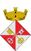 «De sinople, un pino de oro acostado de dos llaves pasadas en aspa con los dientes arriba y mirando hacia fuera, la de oro en banda y por encima de la de plata en barra, a diestra, y de una aspa de oro a siniestra. Al timbre, una corona mural de pueblo.»[35] El escudo en uso por el Ayuntamiento está aprobado por la Generalidad de Cataluña, a fecha de 10/06/1997. |