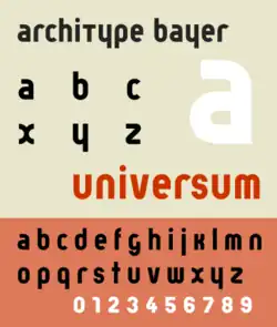 Bayer fue aprendiz del artista George Schmidthammer en Linz. Tras dejar el taller se interesó por el manifiesto Bauhaus de Walter Gropius. Tras estudiar durante cuatro años en la Escuela de la Bauhaus,[1] con profesores como Wassily Kandinsky o László Moholy-Nagy, Gropius nombró a Bayer director de impresión y publicidad. Influenciado por el minimalismo, Bayer desarrolló un estilo visual nítido y adoptó una fuente sans serif completamente en minúsculas para todas las publicaciones de Bauhaus. En 1925 diseñó una fuente sans serif geométrica, universal, cuya versión digital recibe el nombre de Architype Bayer.[2]