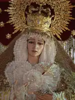 en alpaca dorada, obra de D. Rafael Ahumada Zuaza en el año 1997. Manto en color azul. Saya del mismo color, con antiguos bordados del siglo XIX pasados a nuevo terciopelo por D. José Muñoz Moreno y Dña. Ana Pérez en el año 1995. Presenta varias sayas ricamente bordadas.
