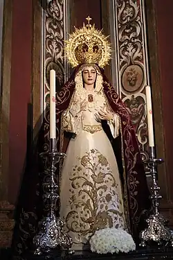 El paso de palio es de 1929. Es de estilo neogótico. El palio y el manto son de terciopelo azul con bordados en oro, fueron diseñados por Antonio Amian y Austria (Córdoba, 1842 - Sevilla, 1933)[5][6] y bordados en el taller de Carmen Capmany.[1]