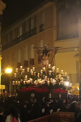 La representación evangélica corresponde al momento de la Expiración de Nuestro Señor Jesucristo, con lo que es de los pocos Crucificados de Jerez representado aún vivo. Exorno floral: Monte de claves rojos donde termina en la cruz con lirios morados.