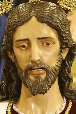 El paso de Cristo representa el momento en que Jesús accede a la Casa de Poncio Pilato y es interrogado por él, en el momento en que le pregunta si él es el Rey de los Judíos.