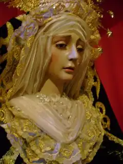 La Virgen, Nuestra Señora de la Soledad, se compró en Madrid el año 1984 de autor anónimo, se compró a la firma Santa Rufina de Madrid y el manto de terciopelo que la cubrió, a las Carmelitas Descalzas de Daimiel (C. Real), quienes lo confeccionaron.
