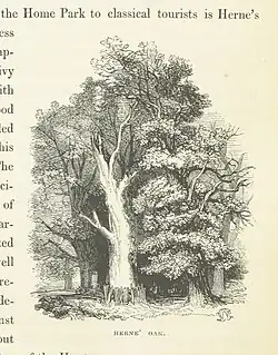 La historia de este Herne, que era guardabosque en tiempos de Isabel, es esta: - Que habiendo cometido una gran ofensa, por la que temía perder su situación y caer en la desgracia, fue inducido a ahorcarse de este árbol.[2]