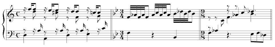 Los temas de Pachelbel son piezas simples parecidas a canciones en dos secciones: cuatro compases en la primera sección y cuatro u ocho en la segunda.[11] Ambas secciones se repiten. Las variaciones se ajustan al mismo concepto: la mayoría son en tiempo común (a excepción de Aria Sebaldina, en la que todas las variaciones son en tiempo triple, como el tema) y exploran varios modelos de armonía constante y contorno melódico.[12] Aunque el frontispicio indica que la obra está pensada para órgano o clavicémbalo, gran parte de la música es más adecuada para este último,[13] en particular las figuraciones brisé, los acordes rotos y una serie de variaciones que introducen varios estilos que no son de teclado: el rasgueo de un instrumento de cuerda pulsada, brisé estilo laúd, etc. (ver Ejemplo 1).[14]