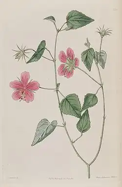 Es un arbusto que alcanza los 1–1.5 m de alto; los tallos esparcidamente estrellado-pubescentes a glabrescentes. Las hojas son lanceoladas u ovadas, a veces 3-lobadas, agudas en el ápice, subcordadas o truncadas en la base, serradas. Pedicelos de 0.5–6 cm de largo; bractéolas del calículo 8–9, lineares, tan largas o más que el cáliz, cáliz de 0.6–1 cm de largo, ciliado en los márgenes, sin nectarios; los pétalos 1–2 cm de largo, lilas o a veces blancos. Los frutos en cápsulas de 0.9–1.3 cm de largo, con semillas 2.5 mm de largo.