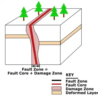 Una zona de falla puede en términos generales dividirse en dos zonas; un núcleo de falla (NF) y una zona de daño (ZD) que lo rodea.[2][5] (Figura 1). El núcleo de falla tiene un espesor medible, mayor cuanto más largo ha sido el desplazamiento de la falla, lo que implica una mayor deformación.[1] La zona de daño rodea al núcleo de falla de forma irregular y puede tener un ancho (perpendicular a la zona de falla) desde pocos decímetros a cientos de metros.[6] Dentro de grandes zonas de falla puede haber múltiples núcleos de fallas y zonas de daño.[1] Núcleos de falla y zonas de daño de origen más reciente pueden sobrelapar con núcleos y zonas de daño más antiguas.