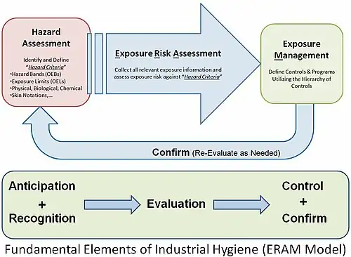 Higiene ocupacional o higiene industrial (IH) es la anticipación, el reconocimiento, la evaluación, el control y la confirmación de la protección contra los peligros en el trabajo que pueden resultar en lesiones, enfermedades o afectar el bienestar de los trabajadores. Estos peligros o factores de estrés suelen dividirse en categorías biológicas, químicas, físicas, ergonómicas y psicosociales.[1] El riesgo de un efecto en la salud de un factor estresante dado es una función del peligro multiplicado por la exposición del individuo o grupo.[2] En el caso de los productos químicos, el peligro puede entenderse por el perfil de respuesta a la dosis, que se basa con mayor frecuencia en estudios o modelos toxicológicos.