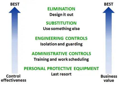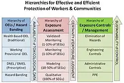 La jerarquía de control define el enfoque utilizado para reducir los riesgos de exposición que protegen a los trabajadores y las comunidades. Estos métodos incluyen eliminación, sustitución, controles de ingeniería (aislamiento o ventilación), controles administrativos y equipo de protección personal. Se debe consultar a higienistas ocupacionales, ingenieros, mantenimiento, administración y empleados para seleccionar y diseñar los controles más efectivos y eficientes basados en la jerarquía de control.