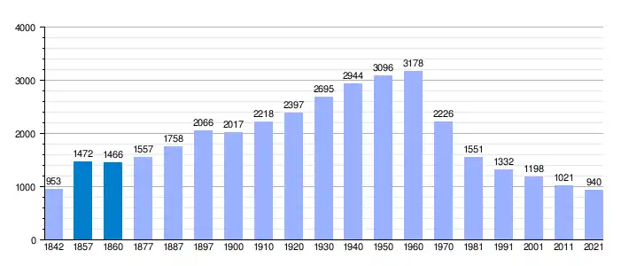 La población se concentra mayoritariamente en las 859 viviendas del núcleo, ascendiendo los efectivos demográficos en su conjunto, en 1986, al 46,1% de los existentes en 1960. La emigración, principal factor explicativo de esta merma demográfica, ha provocado una caída de la tasa de crecimiento natural. La población activa en 1981 alcanzaba el 30,6%, de la que el 74,8% correspondía al sector agrario.