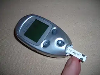 Glucómetro: Calcula el nivel de glucemia. Se puede comprar en una farmacia sin necesidad de receta. El médico o la enfermera pueden ayudar a elegir el equipo correcto para uno, ayudarle a armarlo y enseñarle la manera de usarlo. | ||