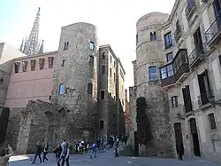 El recinto de Barcino estaba amurallado, con un perímetro de 1,5 km, que protegía un espacio de 10,4 ha.[64] La primera muralla de la ciudad, de fábrica sencilla, se comenzó a construir en el siglo I a. C. Tenía pocas torres, solo en los ángulos y en las puertas del perímetro amurallado, de las que había cuatro: la Praetoria (plaza Nueva), la Decumana (calle Regomir), la Principalis Sinistra (plaza del Ángel) y la Principalis Dextra (calle del Call).[54] Sin embargo, las primeras incursiones de francos y alamanes a partir de los años 250 suscitaron la necesidad de reforzar las murallas, que fueron ampliadas en el siglo IV. La nueva muralla se construyó sobre las bases de la primera, y estaba formada por un muro doble de 2 metros, con espacio en medio relleno de piedra y mortero. El muro constaba de 81 torres de unos 18 m de altura, la mayoría de base rectangular (diez con base semicircular, situadas en las portaladas).[65]