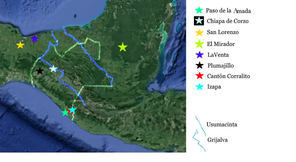Un rasgo notable de esta época es la construcción de grandes sitios a lo largo del río Grijalva. Probablemente estos pueblos se encargaban de cuidar el comercio de jade y obsidiana desde las montañas guatemaltecas hasta el área olmeca. Es difícil conocer la relación exacta que existía entre estas ciudades y La Venta, probablemente fueron señoríos aliados o tributarios. Durante el predominio de La Venta (850 – 400 a. C.) se produjo la separación del mixe y el zoque de su lengua madre. El zoque se desarrolló en la zona olmeca y en los valles centrales y altos de Chiapas; mientras que en la costa del pacífico se usó el mixe.[3]: 40–50 Hacia el 400 se rompe el equilibrio que había reinado en la región por 450 años, con el abandono de La Venta. Chiapa de Corzo e Izapa, sin embargo, continuaron existiendo.[3]: 50–53