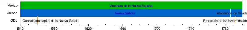 La actual Guadalajara se formó del crecimiento y unión de tres núcleos primitivos de población: Mezquitán, Analco y Mexicaltzingo, que en 1667 se anexaron a la ciudad, fenómeno importante para la posterior consolidación del municipio. Por mandato real de fecha 18 de noviembre de 1791, se dispuso la fundación de la Universidad de Guadalajara en la ciudad del mismo nombre, capital del Nuevo Reino de Galicia. La inauguración de este centro cultural fue el 3 de noviembre de 1792, teniendo como sede el excolegio de Santo Tomás.