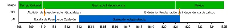 Para la guerra de Independencia, Guadalajara desempeñó un papel importante, ya que fue en esta ciudad donde el cura Miguel Hidalgo , declaró la abolición de la esclavitud . Fue también aquí donde publicó el famoso periódico El Despertador Americano donde publicaba sus ideas. En las cercanías del lugar, en el puente de Calderón, tuvo lugar la batalla donde fueron vencidos los insurgentes. Guadalajara también fue testigo de la muerte de un insurgente, de José Antonio El Amo Torres, quien ayudó a Hidalgo.