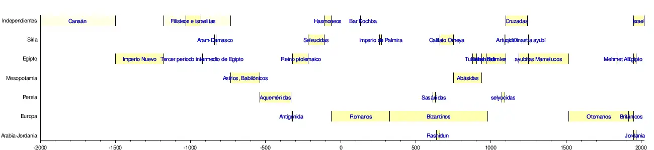 Palestina ya fue citada por Herodoto en el siglo IV a. C.. Con este nombre también la llamaba Roma y luego por el Imperio británico, a una región geográfica en el sur del Levante entre el mar Mediterráneo y el río Jordán (donde Israel y Palestina están hoy), y varias tierras adyacentes. Situada en un punto estratégico entre Europa, Asia y África, y cuna del judaísmo y el cristianismo,[1] la región tiene una larga y tumultuosa historia como encrucijada para la religión, la cultura, el comercio y la política. En la antigüedad, esta región fue controlada intermitentemente por varios reinos independientes y numerosas grandes potencias, incluyendo el Antiguo Egipto, Persia, Alejandro Magno y sus sucesores, el Imperio romano, varias dinastías musulmanas y los cruzados. En la época moderna, la zona estaba gobernada por el Imperio otomano y luego por el Reino Unido. Desde 1948, Palestina se ha dividido en Israel, Cisjordania y la Franja de Gaza. Otros términos para aproximadamente la misma área geográfica incluyen Canaán, Sion, la Tierra de Israel, el sur de Siria, Outremer y Tierra Santa.