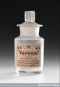 En 1903, Hermann Emil Fischer y Joseph von Mering descubrieron que el ácido dietilbarbitúrico, formado a partir de la reacción del ácido dietilmalónico, el oxicloruro de fósforo y la urea, induce el sueño en los perros. El descubrimiento fue patentado y autorizado por Bayer, que comercializó el compuesto bajo el nombre comercial Veronal como ayuda para dormir a partir de 1904. Las investigaciones sistemáticas del efecto de los cambios estructurales sobre la potencia y la duración de la acción condujeron al descubrimiento del fenobarbital en Bayer en 1911 y al descubrimiento de su potente actividad antiepiléptica en 1912. El fenobarbital estuvo entre los medicamentos más utilizados para el tratamiento de la epilepsia durante la década de 1970 y, a partir de 2014 permanece en la lista de medicamentos esenciales de la Organización Mundial de la Salud.[60][61] En las décadas de 1950 y 1960 se produjo una mayor conciencia sobre las propiedades adictivas y el potencial de abuso de los barbitúricos y las anfetaminas, lo que condujo a restricciones cada vez mayores sobre su uso y a una creciente supervisión gubernamental de quienes los prescribían. Hoy en día, el uso de anfetamina está restringido en gran medida al tratamiento del trastorno por déficit de atención con hiperactividad y el fenobarbital en el tratamiento de la epilepsia.[62][63]