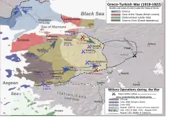 Con el fin de la guerra en noviembre de 1918, el caído Imperio otomano estaba listo para ser repartido entre los vencedores, y Grecia esperaba ahora que los Aliados cumplieran sus promesas. En gran medida, gracias a los esfuerzos diplomáticos de Venizelos, Grecia obtuvo a Tracia Occidental en el Tratado de Neuilly en noviembre de 1919[49] y Tracia Oriental y una zona alrededor de Esmirna en Anatolia occidental (ya bajo administración griega como la Ocupación de Esmirna desde mayo de 1919) en el Tratado de Sèvres de agosto de 1920. El futuro de Constantinopla quedaba por determinar. Pero al mismo tiempo, en Turquía surgió un Movimiento Nacional Turco liderado por Mustafa Kemal (más tarde Kemal Atatürk), que estableció un gobierno rival en Ankara y se dedicó a luchar contra el ejército griego.[50]