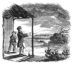 El polifacético estadounidense Benjamin Franklin (1706-1790) investigó los fenómenos eléctricos naturales. Es particularmente famoso su experimento en el que, haciendo volar una cometa durante una tormenta, demostró que los rayos eran descargas eléctricas de tipo electrostático. Como consecuencia de estas experimentaciones inventó el pararrayos. También formuló una teoría según la cual la electricidad era un fluido único existente en toda materia y calificó a las substancias en eléctricamente positivas y eléctricamente negativas, de acuerdo con el exceso o defecto de ese fluido.[63]