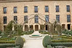 El jardín monástico floreció gracias a los conocimientos conservados por los monjes —especialmente benedictinos—, que guardaban tratados agrícolas de procedencia romana, al tiempo que asimilaron conocimientos de la agronomía islámica gracias sobre todo a los monjes mozárabes que repoblaron la línea del río Duero y el sur de Galicia.[46] Su ubicación se encontraba en el claustro, un recinto porticado abierto al aire libre y rodeado del resto de estancias monásticas, que servía de lugar de descanso y meditación para los monjes. Generalmente se buscaban emplazamientos protegidos del viento, con tierras fértiles y buena irrigación. El claustro era cuadrado, una forma simbólica que aludía a los cuatro elementos, los cuatro evangelios, las cuatro virtudes cardinales, o los cuatro ríos del paraíso.[47] En España hay constancia de numerosos claustros ajardinados, aunque difícilmente se pueda precisar que hayan llegado intactos hasta nuestros días. De los más antiguos son el del monasterio de Sant Cugat del Vallès (siglo XI), formado por naranjos y laureles, o el de Santo Domingo de Silos, conocido por su famoso ciprés solitario. El Monasterio de San Jerónimo de Guisando (El Tiemblo) contiene un claustro cuatripartito con setos de boj recortados en forma de laberinto. El Monasterio de las comendadoras de Santa Cruz en Valladolid introdujo un elemento que aparecería en numerosas ocasiones en el futuro, una fuente rehundida con bancos alrededor. El claustro de la Catedral de Barcelona conserva su fuente de taza doble en el centro, con un templete gótico en un ángulo, y un jardín cerrado por rejas de hierro, con palmeras, magnolios y otros árboles centenarios, y un estanque llamado Fuente de las Ocas. Otros ejemplos son: el Convento de San Francisco y el Real Monasterio de la Trinidad en Valencia, el Monasterio de San Pedro (Soria), San Lorenzo de Trasouto (La Coruña), la Colegiata de Santillana del Mar, o los conventos sevillanos de San Clemente, Santa Inés y Santa Isabel. Algunos monasterios eran también residencias reales, por lo que contaron con ricos y variados jardines claustrales, además de amplios territorios anexos, como en Poblet, Santes Creus, Las Huelgas, San Millán de la Cogolla o Nuestra Señora de Guadalupe (Cáceres). Una de las órdenes que más fomentó la jardinería fue la cisterciense, que se caracterizó por el uso intensivo de la agricultura, el desplazamiento de las fuentes cerca del refectorio —por lo que a veces se instalaban dos fuentes en el claustro— y la edificación de templetes. Algunos ejemplos serían los monasterios de La Vid (La Vid y Barrios, Burgos), Santa María de Valbuena (Valbuena de Duero, Valladolid), San Salvador de Oña (Oña, Burgos) o Las Claustrillas (Burgos).[48]