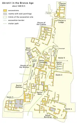 La erupción en Santorini (entre el periodo Minoico tardío IA y el Minoico tardío IB) enterró y preservó una ciudad: Akrotiri. Las excavaciones que han tenido lugar desde 1967 han descubierto un área edificada que cubre una hectárea, sin contar el muro defensivo.[29] El plano de la ciudad estaba formado por una red más o menos ortogonal de calles pavimentadas equipadas con canales de drenaje. Los edificios tenían de dos a tres pisos y carecían de tragaluces y patios; las aberturas en la calle les proveían siempre de aire y luz. La planta baja contenía la escalera y habitaciones que servían de tiendas o talleres; las habitaciones en la planta siguiente, un poco más grandes, tenían un pilar central y estaban decoradas con frescos. Las casas tenían tejados con terrazas colocados sobre vigas que no eran perpendiculares. Estaban cubiertas con una capa vegetal (algas marinas u hojas) y luego varias capas de arcilla,[29] práctica que continúa en las sociedades tradicionales hasta nuestros días.