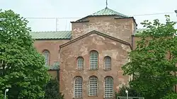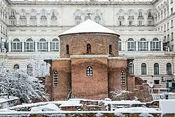 Los edificios centralizados de planta circular u octogonal también se utilizaron para construir baptisterios y relicarios debido a la idoneidad de esas formas para ensamblarse en torno a un único objeto.[71] Los baptisterios comenzaron a construirse a la manera de mausoleos cupulados durante el siglo IV en Italia. El baptisterio octogonal de Letrán o el baptisterio del Santo Sepulcro puede haber sido el primero, y el estilo se extendió durante el siglo V.[72] En la segunda mitad del siglo IV, se desarrollaron baptisterios octogonales cupulados similares a la forma de los mausoleos imperiales contemporáneos en la región del norte de Italia, cerca de Milán.[73] Son ejemplos el baptisterio de San Giovanni in Fonte en Milán (finales del siglo IV), un baptisterio cupulado en Nápoles (siglos IV al VI) y un baptisterio en Aquileia (finales del siglo IV).[Ca. 3] Parte de un complejo de baños iniciado a principios del siglo IV, la iglesia de ladrillo de San Jorge en Sofía era un caldarium que se convirtió a mediados del siglo V. Es una rotonda con cuatro nichos absidiales en las esquinas.[74] El ejemplo mejor conservado de la arquitectura romana en la ciudad, se ha utilizado como baptisterio, iglesia, mezquita y mausoleo a lo largo de los siglos. La cúpula se eleva a unos 14 m del suelo con un diámetro de unos 9,5 m.[75] Su función original como sala del hipocausto se disputa y, según su forma, el edificio puede haber sido originalmente un martyrium cristiano. Los hunos la destruyeron a medias en el año 447 y fue reconstruida en el siglo XI.[76]