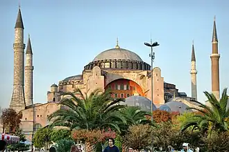 Con el fin del Imperio romano de Occidente, las cúpulas se convirtieron en una característica propia de la arquitectura de la iglesia del Imperio Romano Oriental sobreviviente.[93][98] Una transición de basílicas con techo de madera a iglesias cupuladas parece haber ocurrido allí entre finales del siglo V y el siglo VII, con ejemplos tempranos en Constantinopla, Asia Menor y Cilicia.[99] La primera basílica cupulada conocida puede haber sido una iglesia en Meriamlik, en el sur de Turquía, que data de entre 471 y 494, aunque las ruinas no brindan una respuesta definitiva. Es posible que existieran ejemplos anteriores en Constantinopla, donde se ha sugerido que se habría diseñado la planta de la iglesia de Meriamlik, pero no se ha encontrado ninguna basílica con cúpula antes del siglo VI.[Kr. 9]