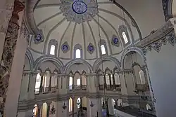 En Constantinopla, Justiniano también derribó la envejecida Iglesia de los Santos Apóstoles y la reconstruyó a mayor escala entre 536 y 550.[115] El edificio original era una basílica cruciforme con un mausoleo cupulado central. El reemplazo de Justiniano aparentemente también fue cruciforme pero con una cúpula central y cuatro cúpulas laterales. La cúpula central sobre el crucero tenía pechinas y ventanas en su base, mientras que las cuatro cúpulas sobre los brazos de la cruz tenían pechinas pero no ventanas.[Fr. 10] Las cúpulas parecen haber sido radicalmente alteradas entre 944 y 985 mediante la adición de tambores con ventanas debajo de las cinco cúpulas y elevando la cúpula central más alta que las demás.[116] La segunda iglesia más importante de la ciudad después de Hagia Sophia, se deterioró después de la ocupación latina de Constantinopla entre 1204 y 1261 y fue demolida por Mehmed el Conquistador en 1461 para construir en el sitio su Mezquita Fatih.[117] La basílica de San Juan (Éfeso ) de Justiniano en Éfeso y la basílica de San Marcos de Venecia son derivados de los Santos Apóstoles.[Fr. 10] Más libremente, la catedral de St. Front de Périgueux y la Basílica de San Antonio de Padua también se derivan de esta iglesia.[118]