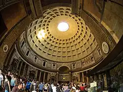 El Panteón de Roma, completado por Adriano como parte de las Termas de Agripa, tiene la cúpula romana más famosa, mejor conservada y más grande.[41] Su diámetro era más del doble de luz que cualquier cúpula anterior conocida.[La. 4] Aunque se considera un ejemplo de la arquitectura de Adriano, hay pruebas de que la reconstrucción del Panteón en su forma actual se inició bajo Trajano.[35] Las especulaciones sobre que el arquitecto del Panteón fuera Apolodoro no han sido probadas, aunque hay similitudes estilísticas entre sus grandes semicúpulas artesonadas en los Baños de Trajano y la cúpula del Panteón.[40] Otros indicadores de que el diseñador pudiera ser Apolodoro o alguien de su círculo que estaba «más cerca en sensibilidad artística de la era de Trajano que de la Adriano» son el tamaño monumental y la incorporación de pequeños pasajes en la estructura. Las dimensiones del edificio parecen hacer referencia al tratado de Arquímedes Sobre la esfera y el cilindro, la cúpula puede usar filas de 28 casetones porque los pitagóricos consideraban que 28 era un número perfecto, y el diseño equilibraba su complejidad con la simplicidad geométrica subyacente.[42] Datada del siglo II, es una cúpula de hormigón no reforzado de 43,4 m de diámetro que descansa sobre un muro circular o rotonda, de 6 m de espesor. Esta rotonda, realizada en hormigón con ladrillo visto, tiene un gran número de arcos de descarga y huecos. Siete nichos interiores y el portal de entrada dividen estructuralmente el muro en ocho pilastras prácticamente independientes. Estas aberturas y vacíos adicionales representan una cuarta parte del volumen del muro de la rotonda. La única abertura en la cúpula es el óculo revestido de ladrillo en la parte superior, de 9 m de diámetro, que proporciona luz y ventilación al interior.[43]
