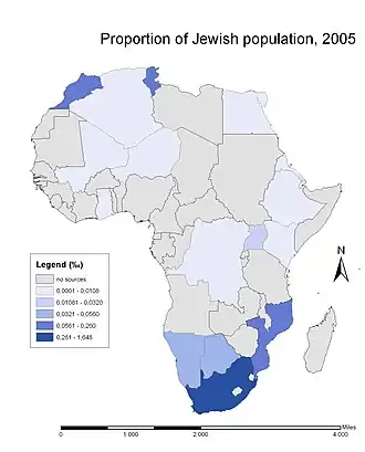 - Sudáfrica tiene una comunidad judía importante de 75 555 personas. Representaban el 0,2 % de la población en 2014,[4] y se redujeron respecto a 2001 cuando representaban el 0,3 % de la población de Sudáfrica.[5] Son sobre todo asquenazíes. Ellos y sus antepasados migraron en su mayoría de Lituania antes de la Segunda Guerra Mundial. Algunos también migraron de Gran Bretaña, Alemania y Europa del Este. En menor medida, judíos sefardíes, procedentes principalmente de la isla de Rodas, también se establecieron en el África subsahariana, en territorios como el Congo Belga. Posteriormente, los miembros de estas comunidades judías migraron a Sudáfrica.