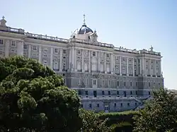 El palacio es un edificio exento, rodeado por los jardines de Sabatini (que pertenecen al propio palacio) al norte, la plaza de Armas (del palacio) y la catedral de la Almudena, al sur, plaza de Oriente al este y Campo del Moro al oeste. Popularmente y sobre todo en Madrid se le conoció también como Palacio de Oriente.[nota 1] El palacio tiene su origen histórico en una construcción defensiva del siglo XI tras la fundación de Madrid por los moros en el siglo IX. De fortaleza musulmana pasó a ser alcázar cristiano y alcázar-palacio de los Austrias ya en el siglo XVI. Este último edificio desapareció en un incendio en el año 1734 en el reinado de Felipe V. Ocupando el mismo solar se levantó un nuevo palacio al gusto de los Borbones (la dinastía reinante en España), siendo el autor de las trazas y director de las obras el arquitecto Juan Bautista Sachetti. Comenzó la construcción en abril de 1738 dilatándose las obras durante años; cuando el tercer rey Borbón Carlos III llegó a Madrid todavía faltaban bastantes detalles para la terminación del palacio, además de que habrían de realizarse algunos cambios a gusto del nuevo monarca que no pudo instalarse en él hasta 1764.[nota 2] A raíz de su construcción se le denominó Palacio Nuevo, apelativo que se mantuvo hasta bien entrado el siglo XIX.[1] El complejo palaciego se fue ampliando y modificando según los deseos y necesidades de cada monarca. Este palacio pertenece al Patrimonio Nacional.