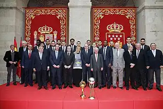 En la temporada siguiente se reforzó con los fichajes de Tremmell Darden, Dontaye Draper y Marcus Slaughter, coincidiendo con la marcha de Ante Tomić y el equipo conquistó la segunda Supercopa de España del club de nuevo frente al F. C. Barcelona, además de conquistar su 31.º título de Liga con una gran actuación de Felipe Reyes, MVP de la final, y con un registro de 38 victorias en 44 partidos. En Europa, consiguió tras 18 años llegar a la final four de la Euroliga. En ella venció una vez más a los catalanes en las semifinales antes de perder el título frente al Olympiakós Piraeus por 100-88. Las temporadas siguientes el club siguió aumentando su palmarés nacional con otra Supercopa, otra Copa del Rey, consagrándose jugadores como Llull o Mirotić, y llegar a una nueva final de la Euroliga,[69] la 16.ª de su historia. Del mismo modo que la anterior, se escapó en el partido decisivo tras caer por 98-86 frente al histórico rival del Maccabi Tel Aviv Basketball Club.[70]