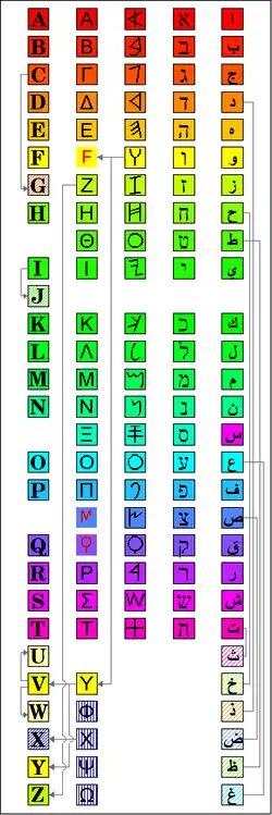 La tabla siguiente es un esquema de los nombres y forma de las letras del alfabeto fenicio y los alfabetos derivados de él, en el orden del fenicio, junto con el ugarítico.