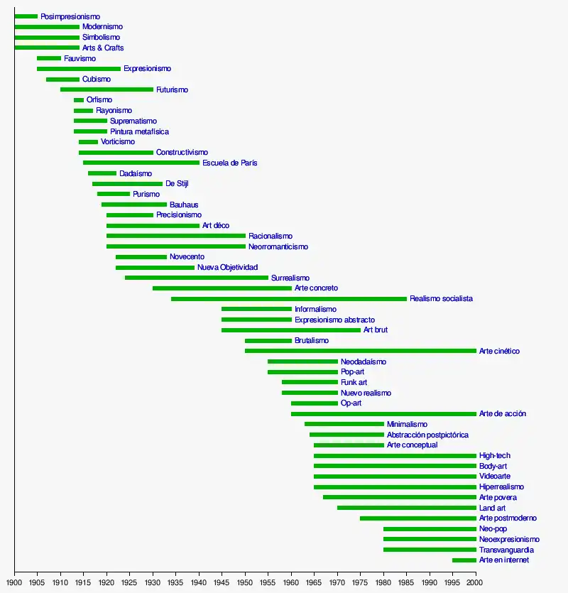 La sucesiva ampliación del listado de las «artes principales» llegó en el siglo XX hasta el número de nueve: la arquitectura, la danza, la escultura, la música, la pintura, la poesía —entendida de forma amplia como literatura con intención estética, que incluye los distintos géneros del teatro y la narrativa—, la cinematografía, la fotografía y la historieta (o cómic).