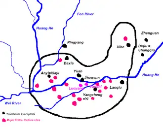 La cultura de Erlitou (hacia 1900-1350 a. C.), llamada así por su lugar de origen en el moderno Henan, dominó el norte de China a principios del segundo milenio a. C.,[11] cuando las sociedades urbanas y el bronce aparecieron por primera vez en la zona. Los cauris, el estaño, el jade y la turquesa que fueron enterrados en Erlitou sugieren que comerciaron con muchos vecinos. Se necesitaría una fuerza laboral considerable para construir los cimientos de tierra apisonada de sus edificios. Aunque la sociedad altamente estratificada de Erlitou no ha dejado nada escrito, algunos historiadores han identificado con ella a la legendaria dinastía Xia mencionada en las crónicas tradicionales chinas como anterior a la de Shang.[8]