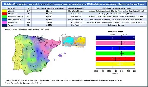 Por otro lado se detecta la ascendencia del noroeste de África (que varía de 0 al 11% en función de la distancia al estrecho de Gibraltar) en la población de hoy en día. Esta ascendencia está relacionada con un evento de mezcla que involucra a las poblaciones de origen de tipo europeo y noroeste de África que se sitúa entre los años 860–1120 dC, lo que implica mayores impactos genéticos en esa época del gobierno musulmán en Iberia. Estos resultados indican impactos genéticos claros de los movimientos de población asociados con la conquista musulmana y la posterior Reconquista.[34] El estudio evidencia que los españoles modernos tienen fracciones de ascendencia regionalmente diferentes de un grupo más similar al moderno noroeste de África.