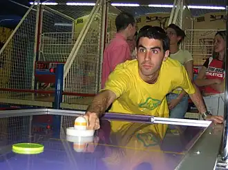 El aero-jóquey,[2] aero-hockey o hockey de aire es un deporte de salón y de precisión en el cual dos personas o dos parejas (dobles) compiten sobre una mesa de hockey de aire, utilizando mazos para impulsar el uso de un disco, con la finalidad de anotar goles en la portería contraria.