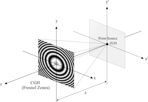 La segunda estrategia computacional para generar HGC se basa en el concepto de fuente puntual, donde el objeto se descompone en un conjunto de puntos luminosos cuya intensidad de luz puede variar entre 0 (tal punto no es una fuente puntual de luz) y 1 (tal punto es una fuente puntual de luz). De esta manera se calcula un holograma elemental para cada una de estas fuentes puntuales y el holograma final se obtiene por superposición de todos estos hologramas elementales. Este método fue reportado por primera vez por Waters,[12] cuya hipótesis principal se originó junto con Rogers,[13] quien reconoció que una placa de zona de Fresnel (Fresnel zone-plate) podría considerarse como un caso especial del holograma propuesto por Gabor.[14] Pero, en la medida en que una mayor cantidad de los puntos luminosos que conformaban el objeto tenían intensidad distinta de cero, la complejidad computacional del problema se incrementaba significativamente, al punto de ser más convenientes los métodos basados en la transformada de Fourier.
